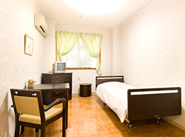 | 居住設備 | 個室:居室面積12.42㎡ 夫婦居室:居室面積24.84㎡ エアコン・介護ベッド・チェスト・テーブル・イス・テレビ・カーテン・ナースコール等 |