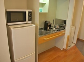 | 居住設備 | 居室面積:25.03m² ~34.56m² 設備:洗面台、トイレ、収納、下駄箱、浴室、ミニキッチン、洗濯機スペース、玄関収納椅子、エアコン、TV端子、電話ジャック、インターホン、緊急呼出装置、 |