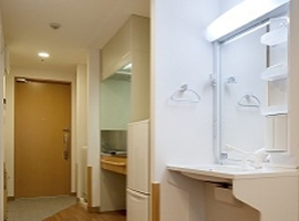 | 居住設備 | 居室面積:25.17m² ~27.2m² 設備:洗面台、トイレ、収納、下駄箱、浴室、ミニキッチン、洗濯機スペース、玄関収納椅子、エアコン、TV端子、電話ジャック、インターホン、緊急呼出装置 |