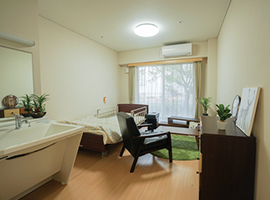| 居住設備 | 全室個室(18.00㎡~19.22㎡)/車椅子でも入れる洗面・トイレ付き/ソファーや椅子などの設置も可能 エアコン、洗面所、トイレ、ケアコール、スプリンクラー、介護ベッド、収納 |