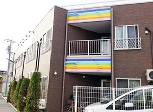 会社理念<太陽・息子・感謝>の感謝からSUN久倶楽部(サンキューグラッチェ)とネーミングされました。外観のレインボーカラーは、各国の「感謝」の文字で飾られています。